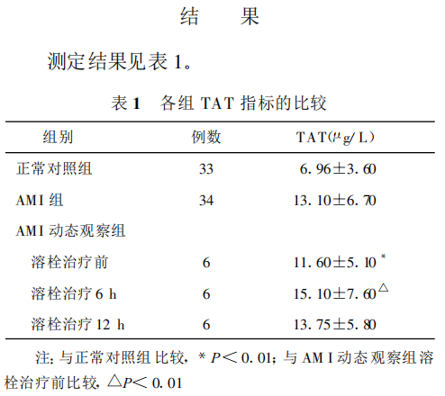 对临床确诊的34 例 AMI 患者和33 名正常对照者, 采用 ELISA 法检测血浆凝血酶抗凝血酶复合物(TAT), 对其中6 名患者溶栓前、溶栓6 h 及溶栓12 h 血浆TAT 进行动态观察并与正常对照组进行比较。