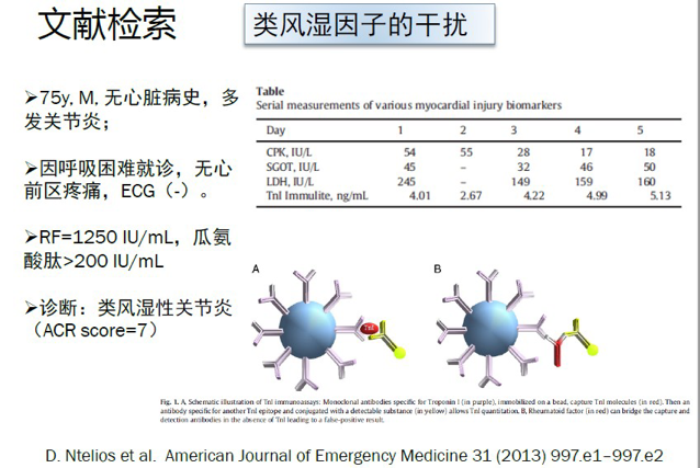类风湿因子是针对免疫球蛋白G的自身抗体,其对肌钙蛋白测定的影响类似于嗜异性抗体,可以导致肌钙蛋白的假阳性升高。据报道约1%肌钙蛋白升高的患者是单纯地由于类风湿因子升高导致的。上面第二个病例因患者无动物及疫苗接触史,因此排除了嗜异性抗体的影响,而考虑类风湿因子对肌钙蛋白测定的影响。