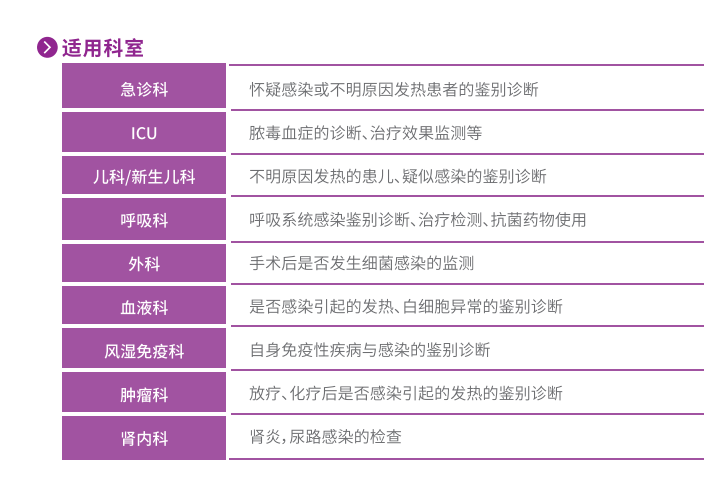 宫内感染的辅助诊断,新生儿出生前发生的感染,可发生于妊娠期各阶段,病原体(细菌、病毒、真菌、原虫、螺旋体等)经母亲血流通过胎盘感染胎儿。有研究表明,新生儿宫内感染采用PCT检测具有灵敏度高、特异性好的特点,联合IL-6检测是临床诊断新生儿宫内感染的有效方式。