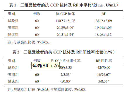 选取2019年6月至2020年6月本院((化州市人民医院)收治的60例RA患者作为试验组,选取同期本院收治的60例其他类型风湿病患者作为参照组, 另选取同期本院60名健康体检者作为健康组。所有受检者均行抗CCP抗体和类风湿因子(RF)检测。比较三组受检者的抗 CCP抗体及RF水平、抗CCP抗体及 RF阳性率。将试验组患者根据病程长短分为非早期组和早期组,根据疾病分期分为非骨侵蚀组和骨侵蚀组,分析不同亚组的抗CCP抗体水平。并分析骨侵蚀组不同分期患者的抗CCP抗体水平。