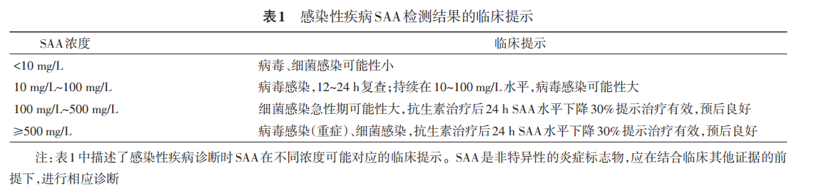 SAA水平持续高于10mg/L且低于100 mg/L,病毒感染可能性大;SAA在细菌感染急性期的水平持续高于100 mg/L,对于席卷感染急性期具有较强的提示性作用。