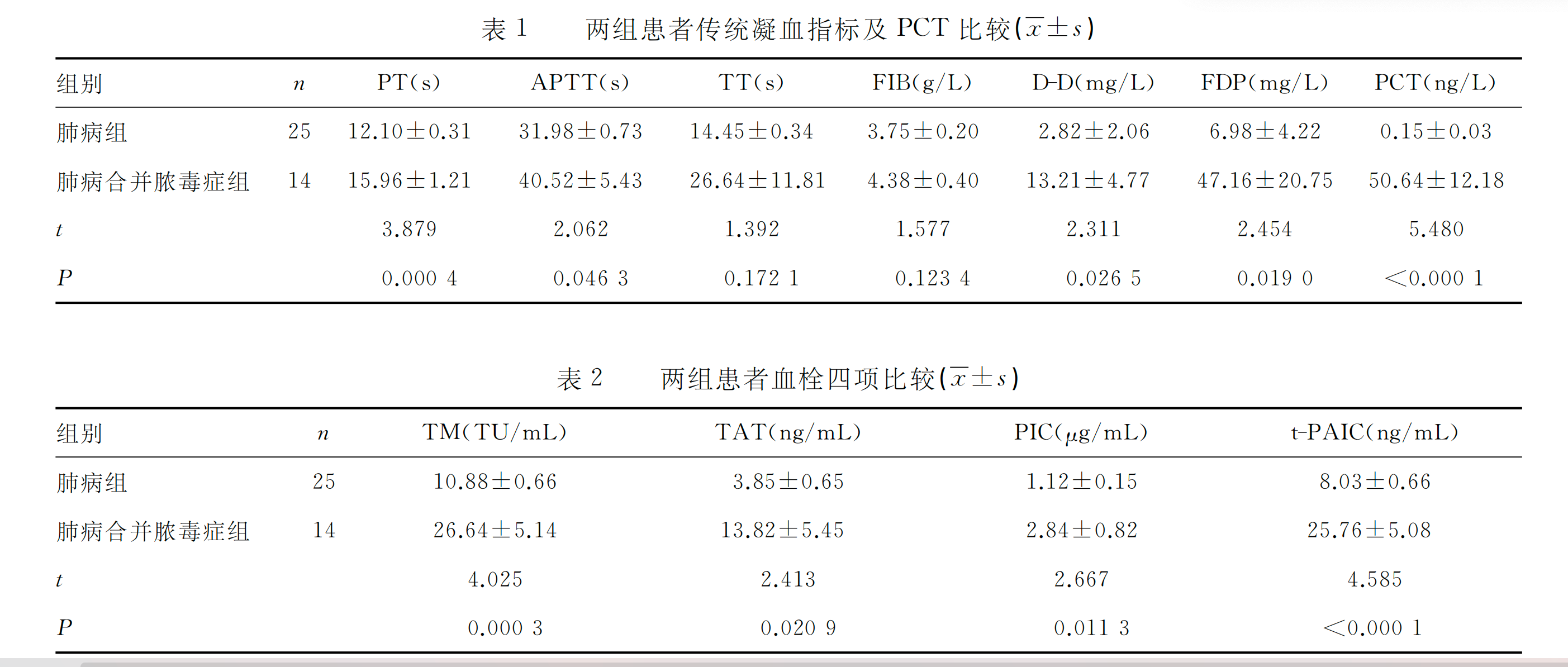 以上两组数据显示:肺病合并脓毒症组患者的血栓四项水平均显著高于肺病组。