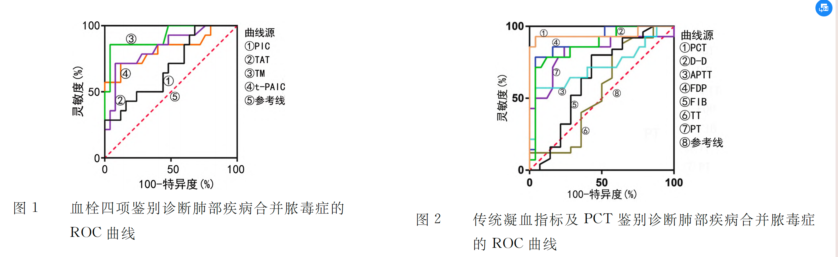 总结以上结果:本研究中涉及的肺部疾病主要为COPD,目前临床上认为COPD是一种慢性炎性疾病,可累及患者机体多个系统,因此其又是一种全身性的系统综合征。COPD患者通常存在酸碱、电解质失衡,内皮细胞受到酸性刺激后诱导内源性凝血系统激活,患者处于二氧化碳潴留以及缺氧状态,导致肝肾功能及血管内皮细胞受损,抗凝与凝血系统失衡。凝血系统被激活后,纤溶酶将纤 维蛋白和FIB降解成D-D和FDP。传统指标D-D和FDP被认为是凝血和纤溶同时激活的标志,但D-D水平升高容易受底物量、血循环、炎症、代谢等多种因素的影响。而血栓四项TAT、PIC、t-PAIC、TM分别代表凝血系统的激活、纤溶系统的激活以及血管内皮系统的损伤等,可在传统凝血指标水平升高前升高,较敏感地监测体内凝血情况,为临床诊断提供有效信息。