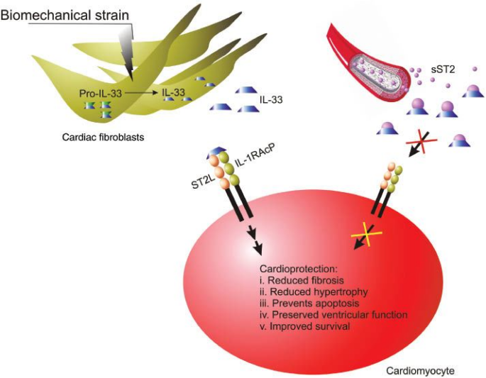 生长刺激表达基因2蛋白(ST2),是白介素1受体家族成员之一,有跨膜型(ST2L)和可溶性(sST2)两种形式。